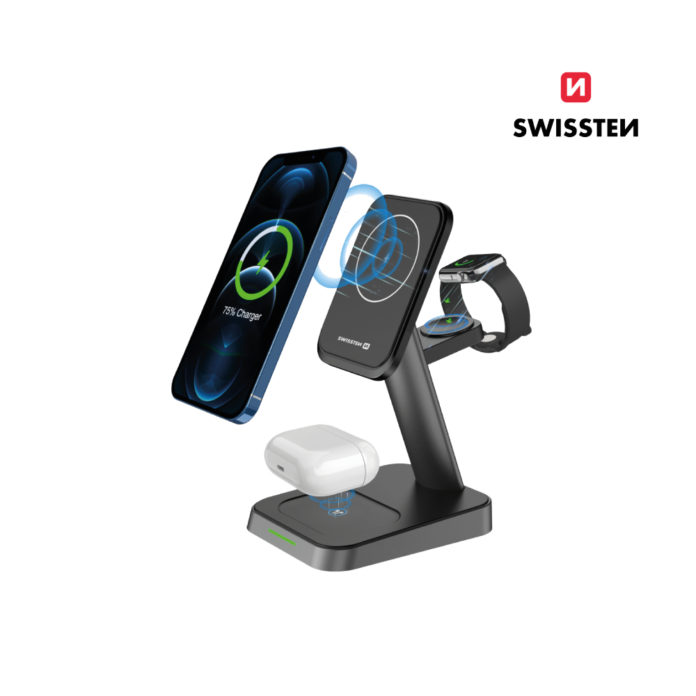 Este carregador sem fios 3 em 1 da Swissten é a combinação perfeita de estilo e funcionalidade. O seu design elegante em preto, irá complementar decoração da tua secretária ou mesa de cabeceira.