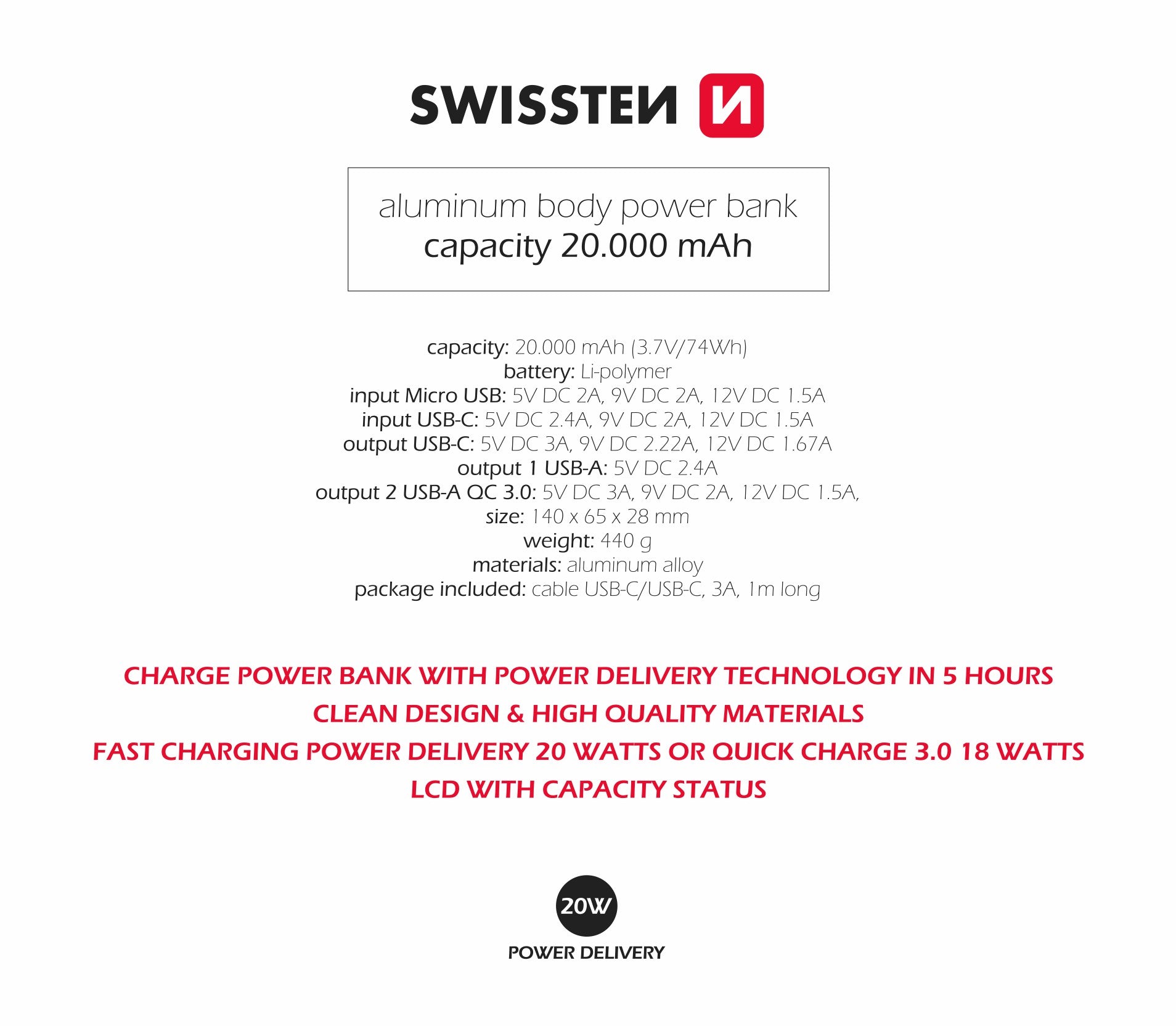 A Power Bank Swissten de 20.000 mAh combina alta capacidade de carregamento com um design elegante em alumínio. Equipada com entradas microUSB e USB-C, e saídas duplas USB-A e uma USB-C, suporta carregamento rápido através das tecnologias Power Delivery (PD) e Quick Charge (QC). Ideal para manter os seus dispositivos carregados durante viagens ou uso diário.