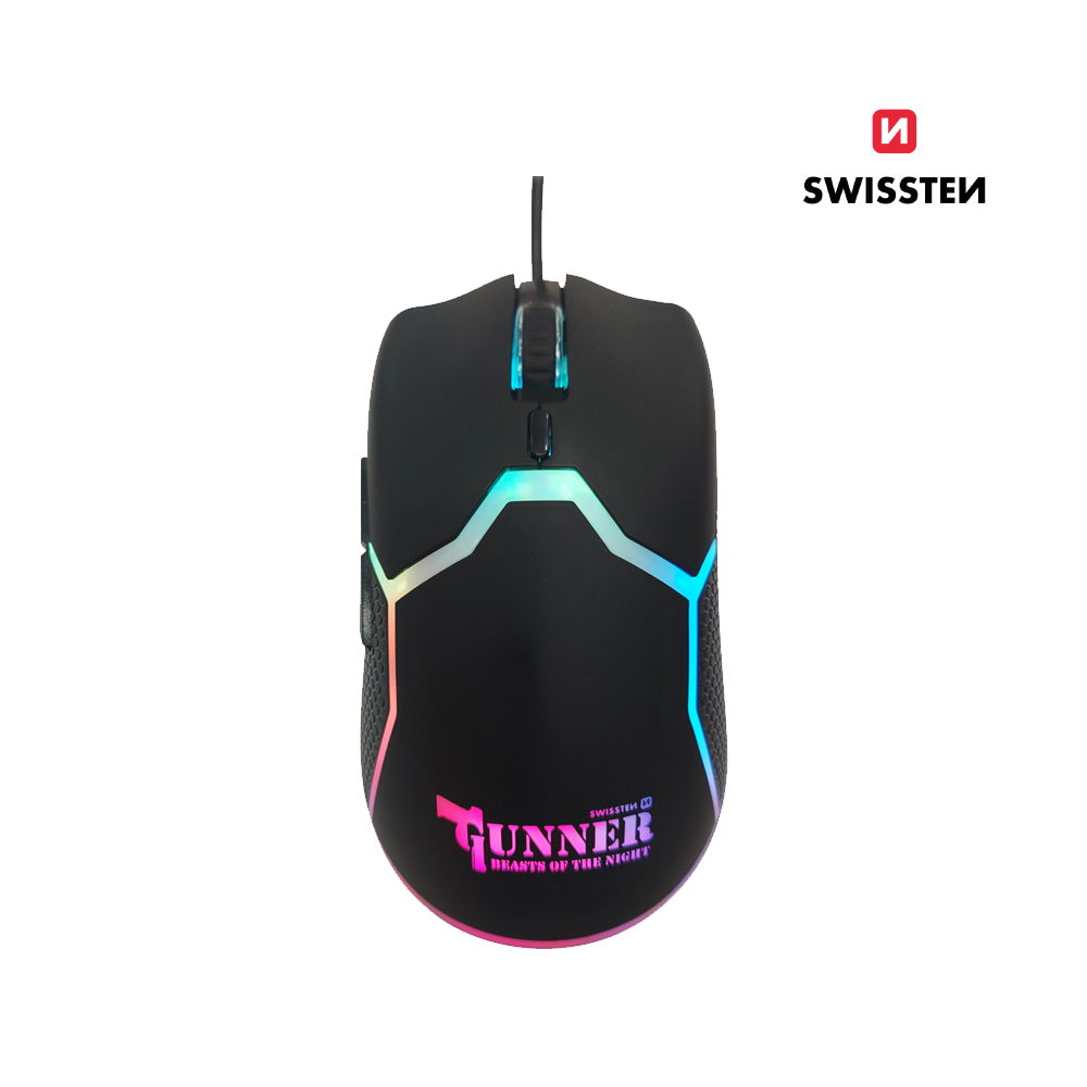 O Swissten Gaming Mouse GUNNER é um rato com cabo desenhado para gaming, oferecendo resolução até 7200 DPI, iluminação RGB personalizável, construção ergonómica leve (≈120 g) e desempenho estável com conector USB‑A banhado a ouro.