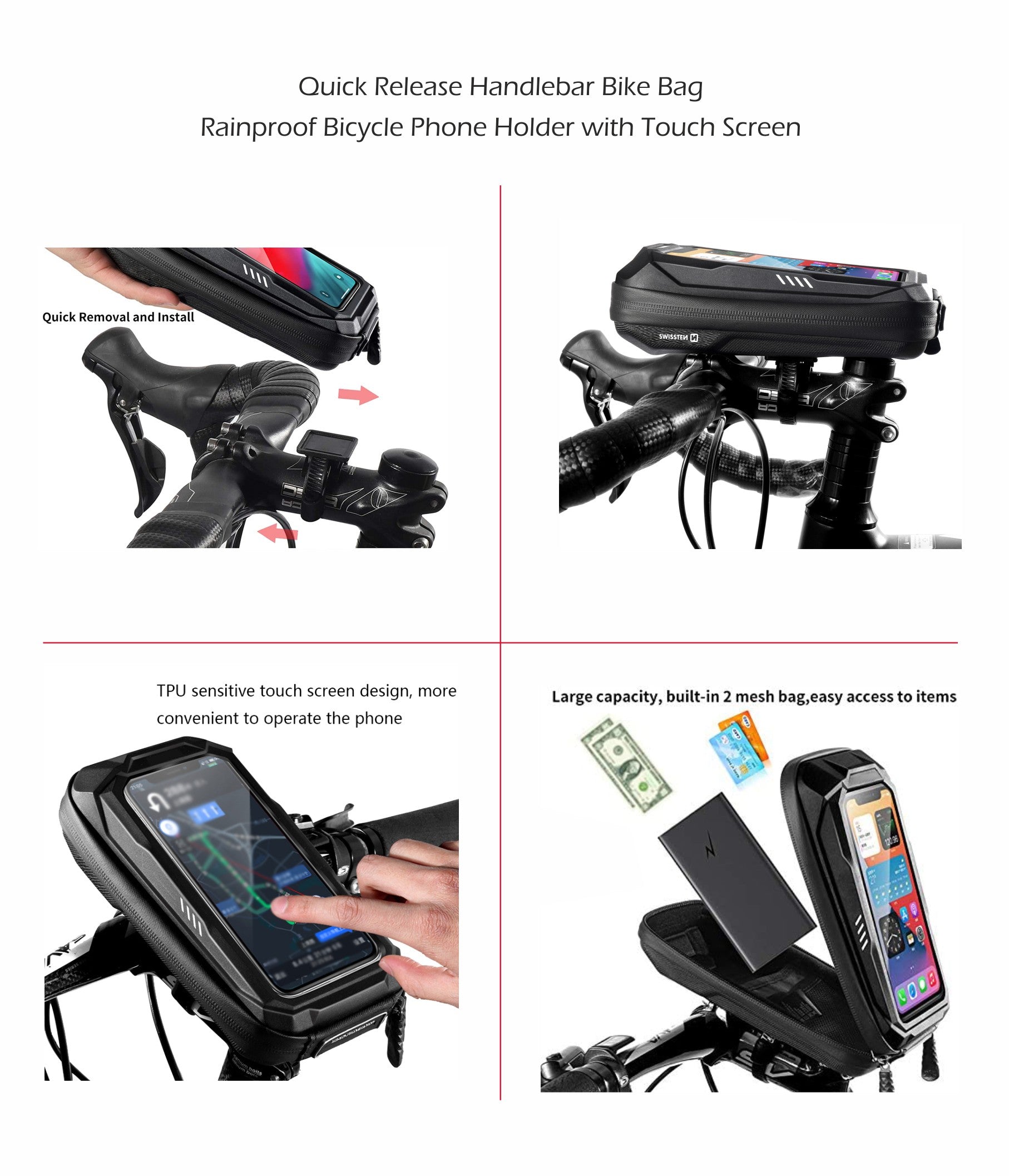 Proteja o seu smartphone enquanto pedala com o suporte impermeável Swissten Waterproof Bike Holder 4. Compatível com dispositivos até 6,7 polegadas, oferece proteção contra chuva e poeira. Com ajuste de 360 graus, permite posicionamento ideal do ecrã para navegação ou visualização de mapas. O material robusto garante segurança e longa durabilidade.